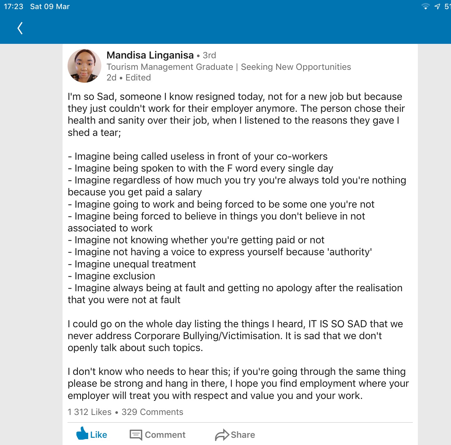 9. Of a different race. The article talks about minority race groups as targets, however, in South Africa, the experience is different because the majority of leadership in companies are White or Indian. Bullying is normally done by those who are in a superior social position. Anecdotal evidence from social media indicates that black and coloured employees and foreign nationals are more affected by bullying in the workplace.